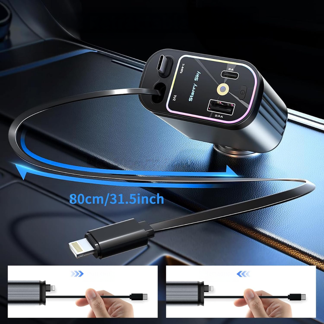 Compacto, moderno y fácil de usar, se adapta a cualquier toma de corriente del auto. Su cable extensible mantiene el interior limpio y organizado, combinando funcionalidad y estilo. Una carga rápida, ordenada y sin complicaciones, estés donde estés.